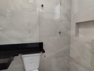 1 Banho social piso e revestimento em porcelanato, Bancada de granito, preparado para água quente, teto rebaixado, Nicho.
