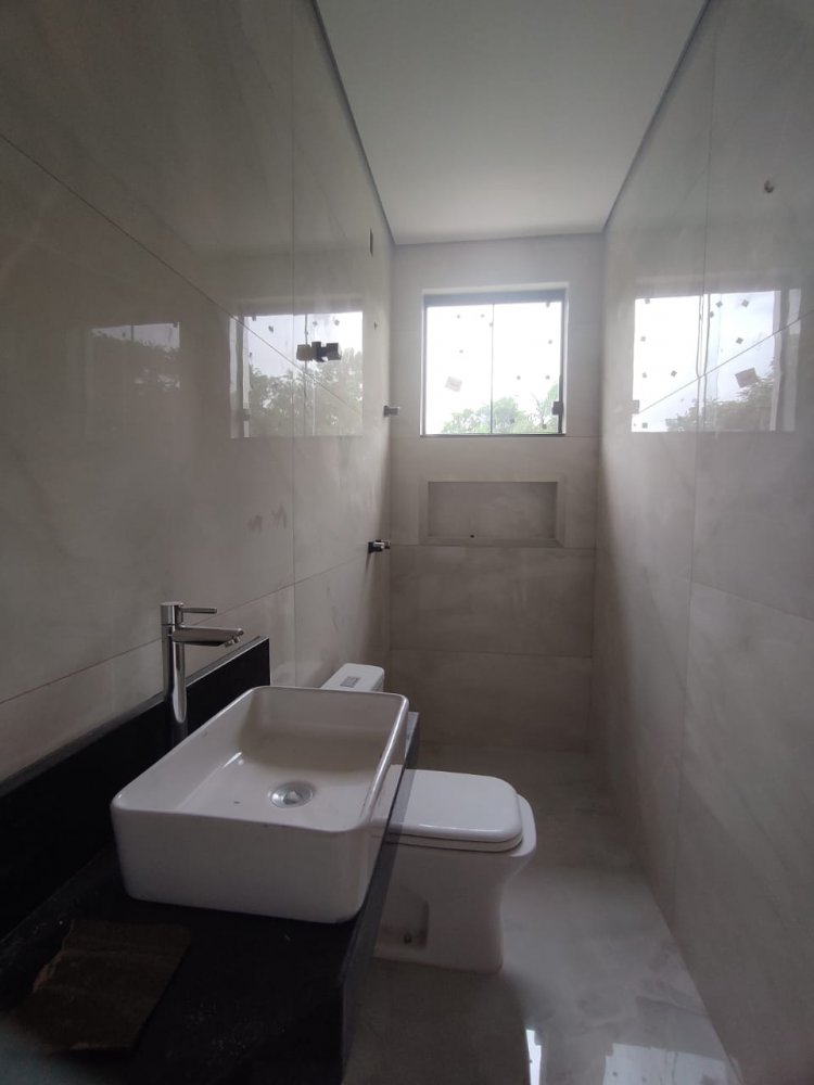 1 Banho social piso e revestimento em porcelanato, Bancada de granito, preparado para água quente, teto rebaixado, Nicho.