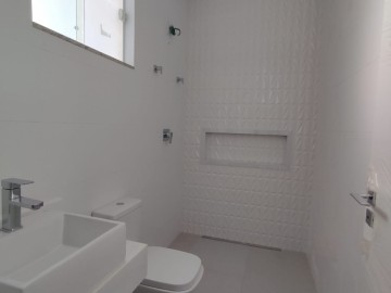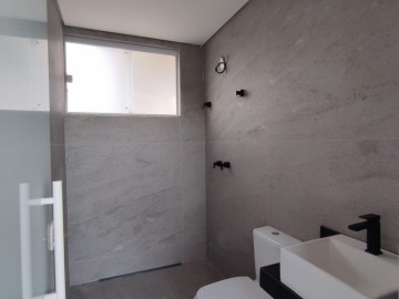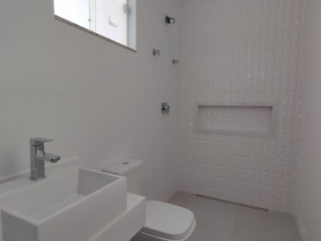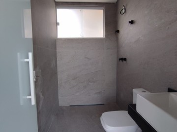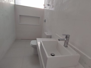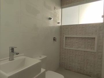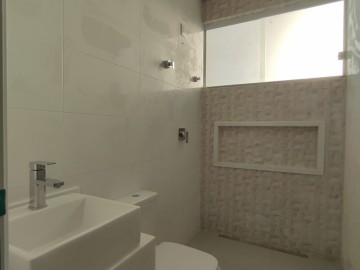1 Banho social piso e revestimento em porcelanato, Bancada de granito, teto rebaixado, preparado para água quente, Nicho.