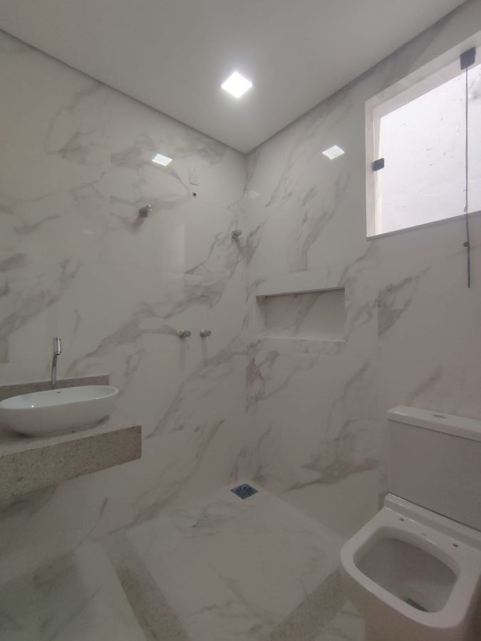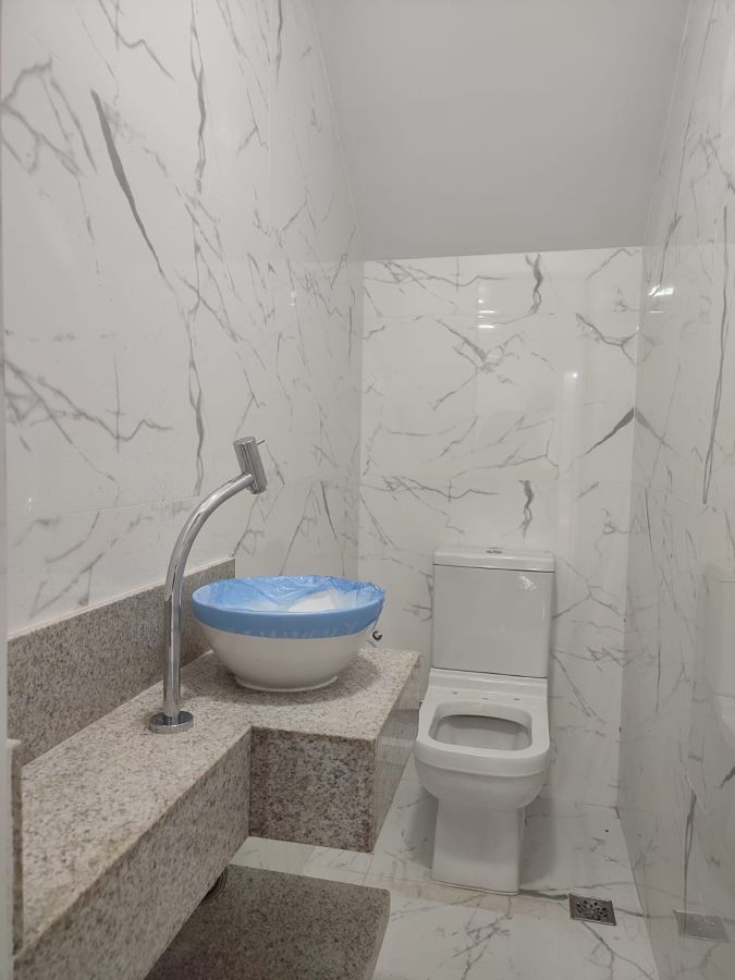 1 Banho social piso e revestimento em porcelanato, Bancada em granito, preparado para água quente, Nicho.